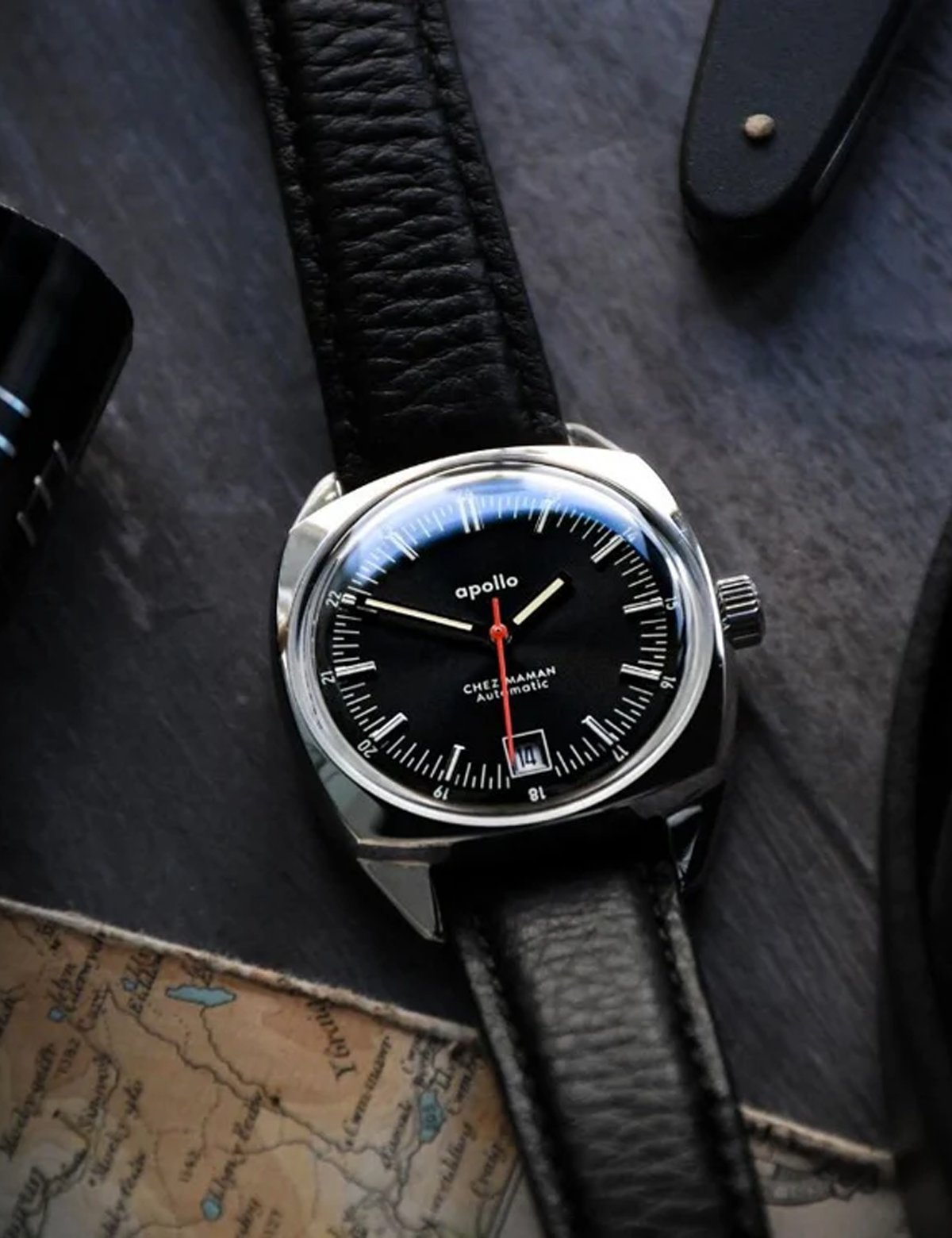 L’Apollo Silver Black Sand puise dans l’esthétique des montres des années 50‑60, avec un boîtier acier de 35 mm et un cadran noir sable réchauffé par des index beiges.