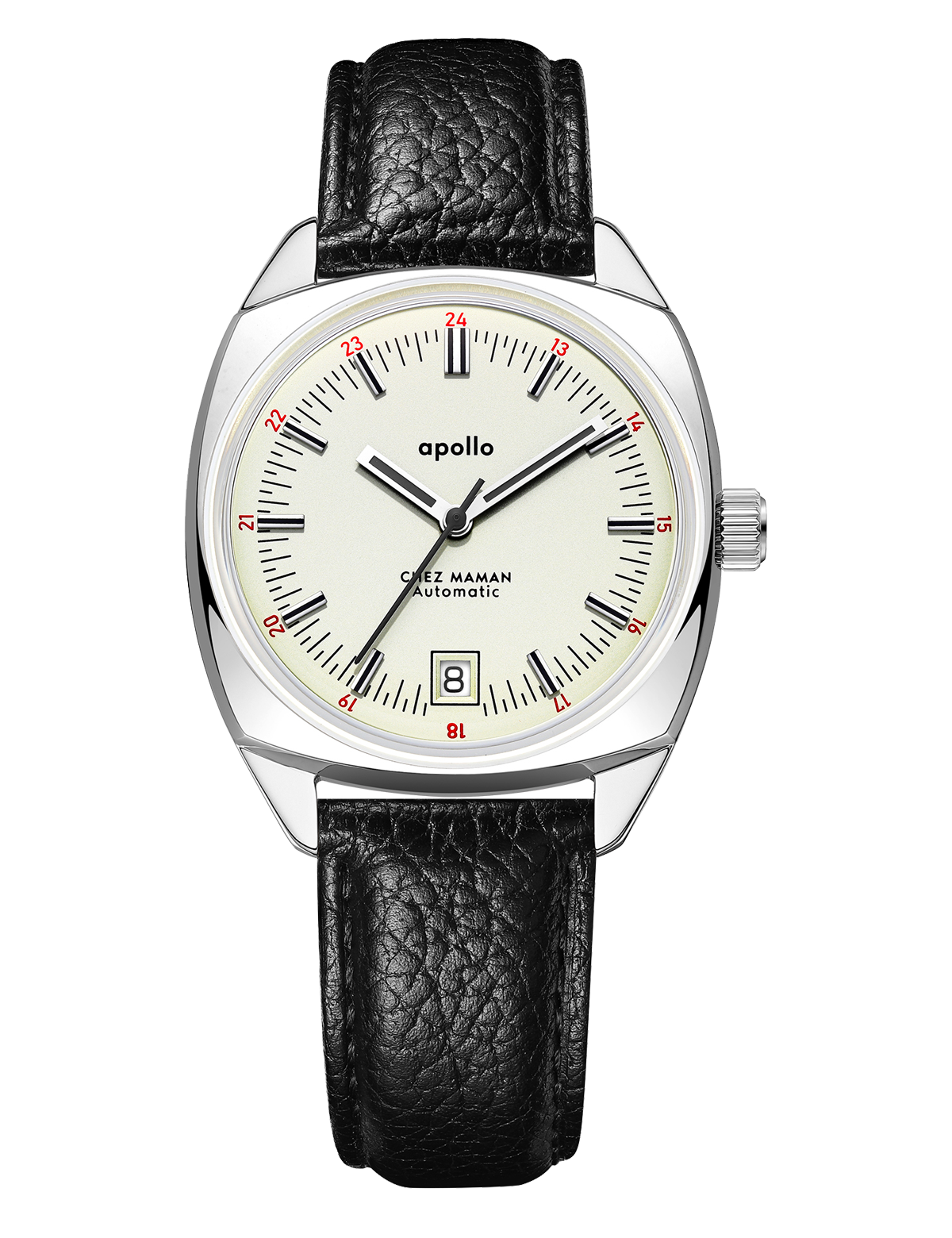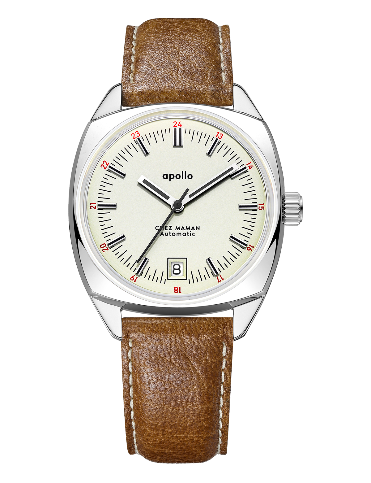 L’Apollo Silver Moon s’inspire des montres des années 50-60, avec un boîtier acier de 35 mm et un cadran d’un beige froid, presque lunaire.