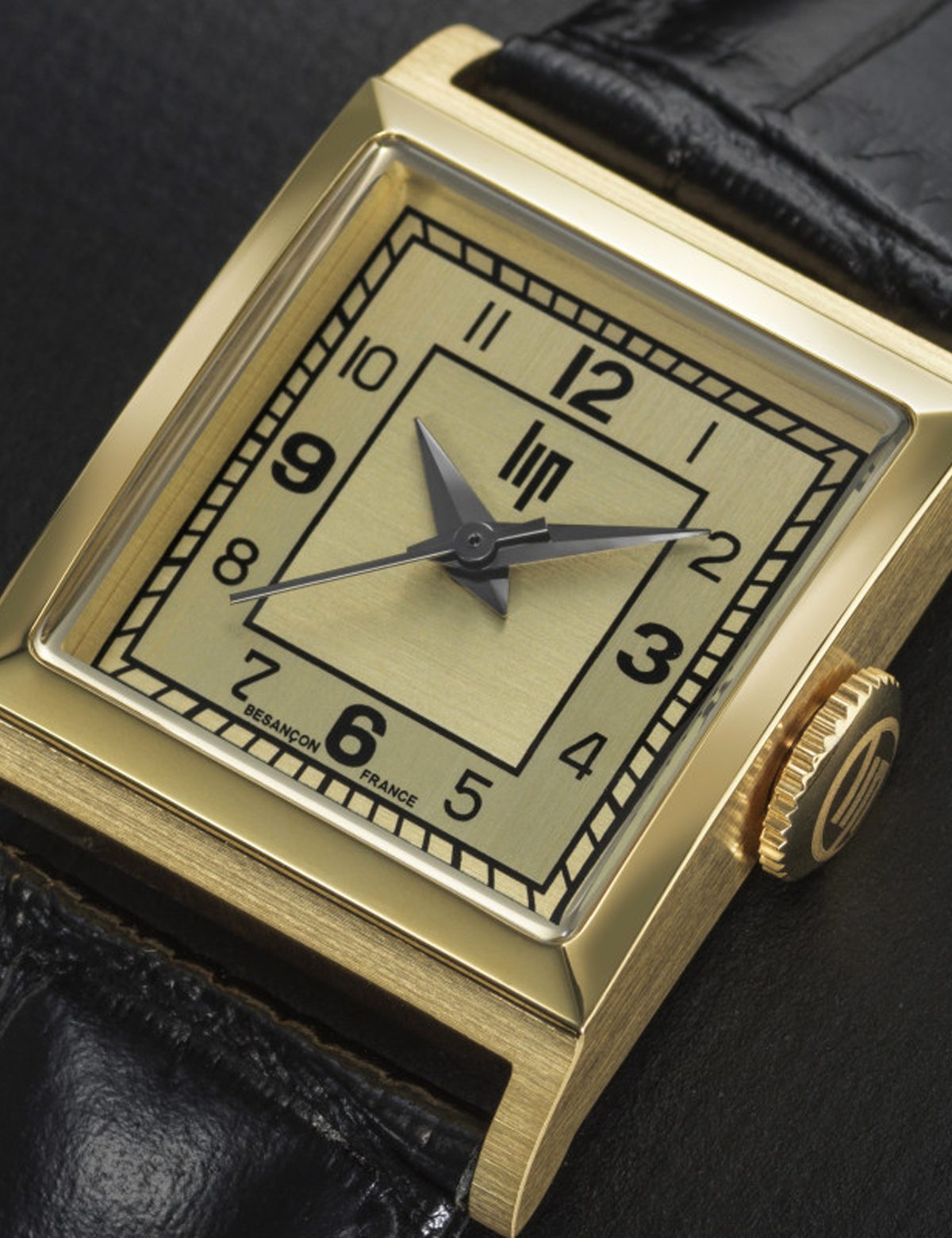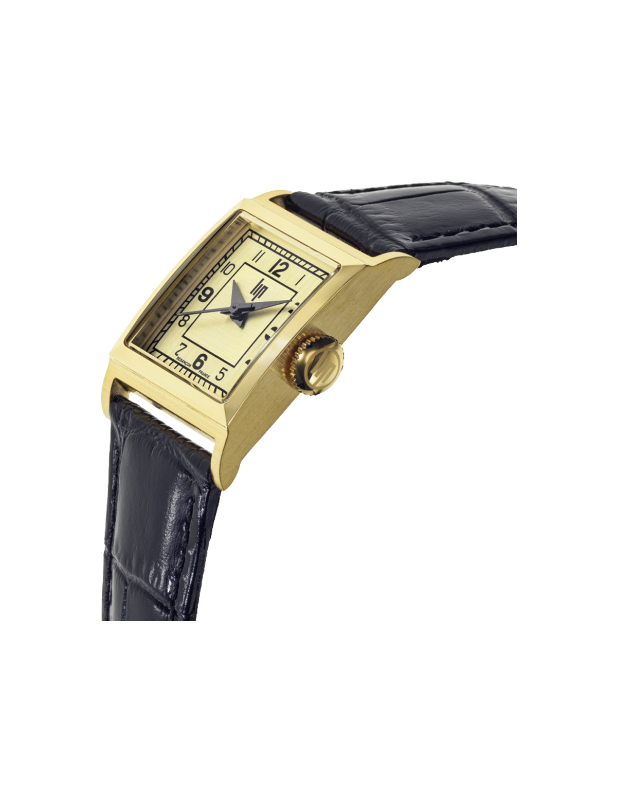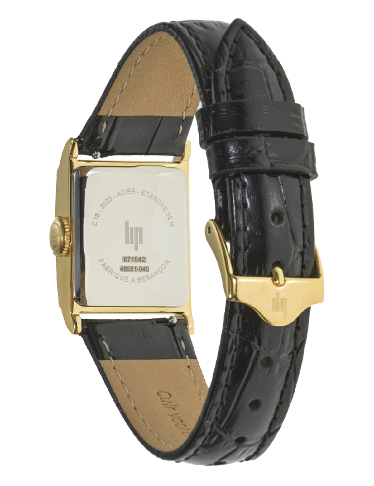 Le bracelet en cuir noir façon croco, avec boucle dorée à l’effigie Lip, complète son allure rétro chic avec distinction.