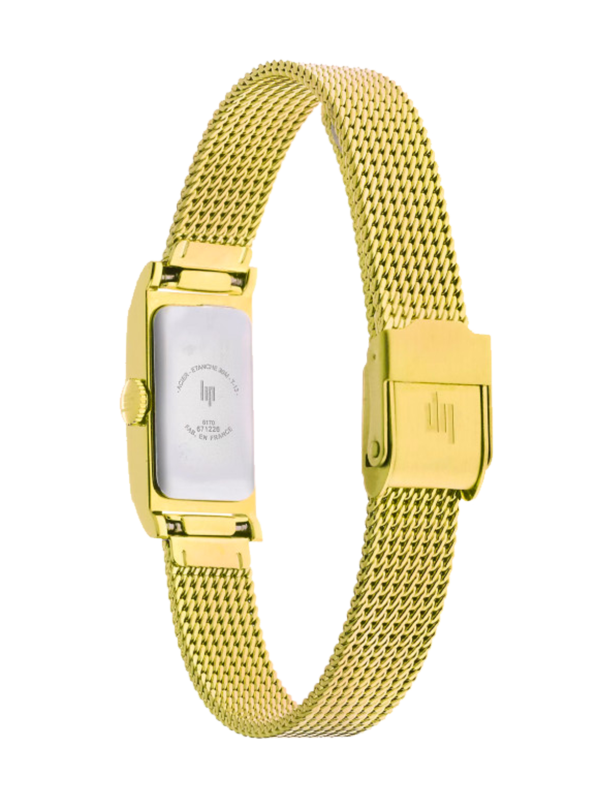 Le bracelet en maille milanaise dorée, souple et ajustable sans outil, apporte la touche finale de sophistication et de confort.l.